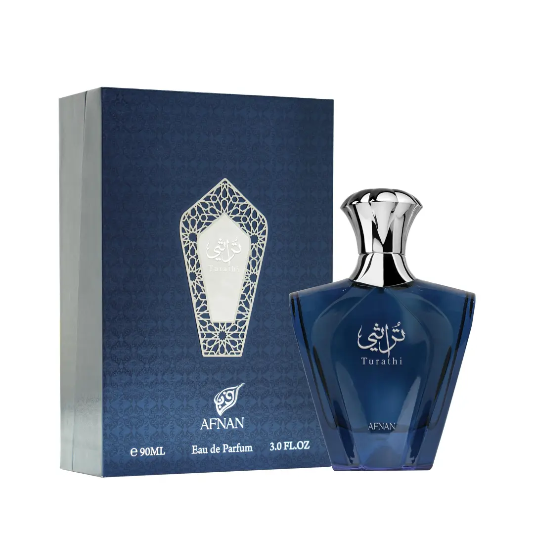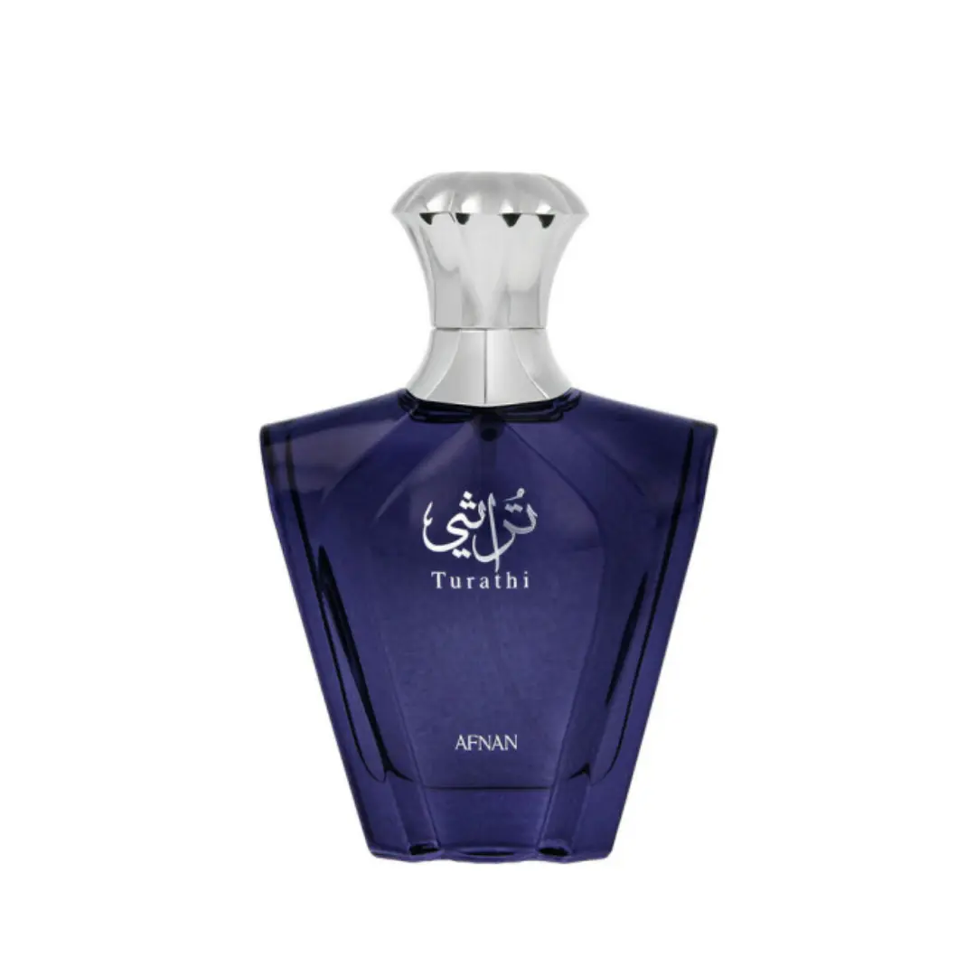 Turathi Blue de Afnan, la esencia de la elegancia masculina con un toque marino y amaderado. Esta colonia árabe para hombre despliega una frescura aromática sofisticada con un carácter distintivo.